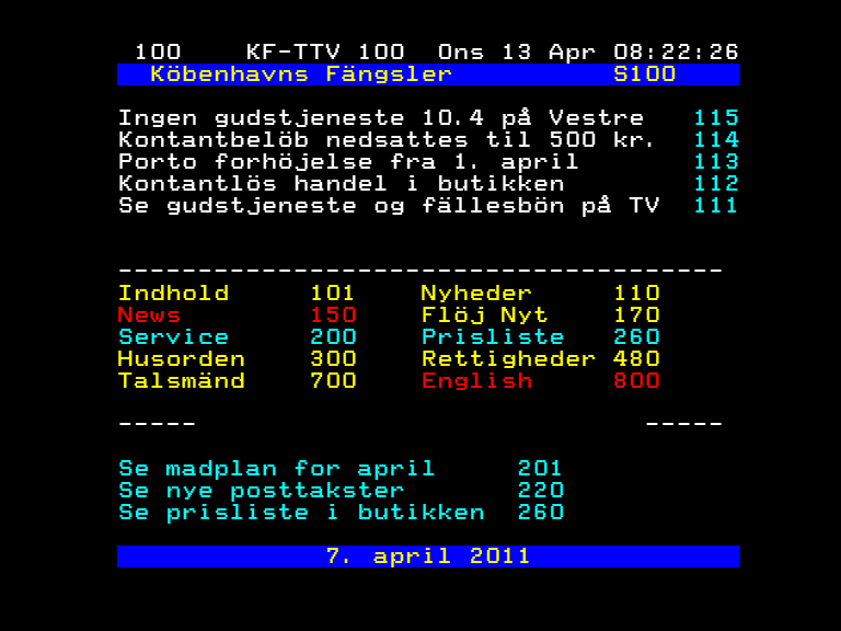 7. dec. 2020: Tekst-tv.dk har forsket lidt i tekst-tv i danske fængsler. Tekst-tv er faktisk forbudt i danske fængsler, og man fjerner tekst-tv-modulet i de indsattes fjernsyn, pga. risikoen for at meddelelser kan overføres via chat eller annoncer på tekst-tv. Man har dog i nogle fængsler et internt tekst-tv. Til højre ses en aftegning af en side fra Københavns Fængslers tekst-tv fra 7. april 2011. Siderne vises som forudoptaget tekst-tv på enten VHS eller en info-kanal.